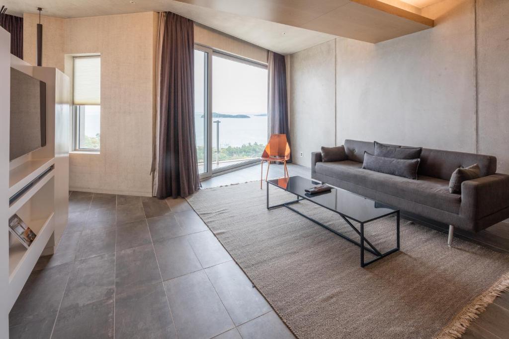 We stayed 1 night before returning home. The hotel is very nice! The beds are comfortable. The softest we had I. Seoul! The sheets are nice and soft. The shower has great water pressure and there is a deep soaking tub which they provide at salts to put in. The breakfast is a buffet with lots of choices. There is a great coffee shop called C27 about 5-10 min away by uber. It was 5 stories tall with each level a different city theme. There is a rooftop with a great view of the water. We saw the sunset. It was a great ending to our Korea trip.