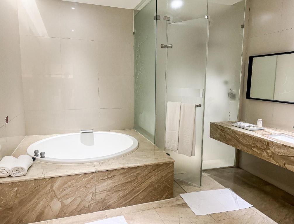 Rommet har også en egen stue, noe som gir deg ekstra plass til å slappe av. Du vil sette pris på den private balkongen eller terrassen, hvor du kan nyte en kopp kaffe mens du ser ut over omgivelsene. De praktiske fasilitetene inkluderer et kjøleskap for oppbevaring av snacks og drikke, samt gratis flasker med vann for å holde deg hydrert. Badet er utstyrt med nødvendige toalettartikler og hårføner, og du kan nyte renheten med friske sengetøy og håndklær. For å sikre en god natts søvn, er rommene utstyrt med blackout-gardiner som blokkerer ut lys, noe som gir deg muligheten til å sove uforstyrret.
