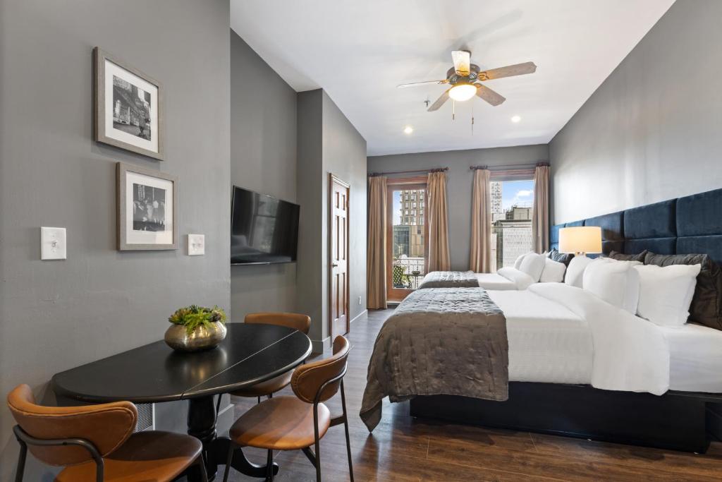 Rommet er også utstyrt med en kaffetrakter og te- og kaffefasiliteter, slik at du kan starte dagen med en varm kopp kaffe på den private balkongen eller terrassen. Badet har alt du trenger, med hårføner og kvalitetstoalettartikler, samt myke håndklær og sengetøy som gir en luksuriøs følelse. Blue Moon Hotel kombinerer stil og komfort, og gir deg et perfekt tilfluktssted i hjertet av New York.