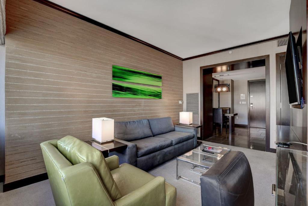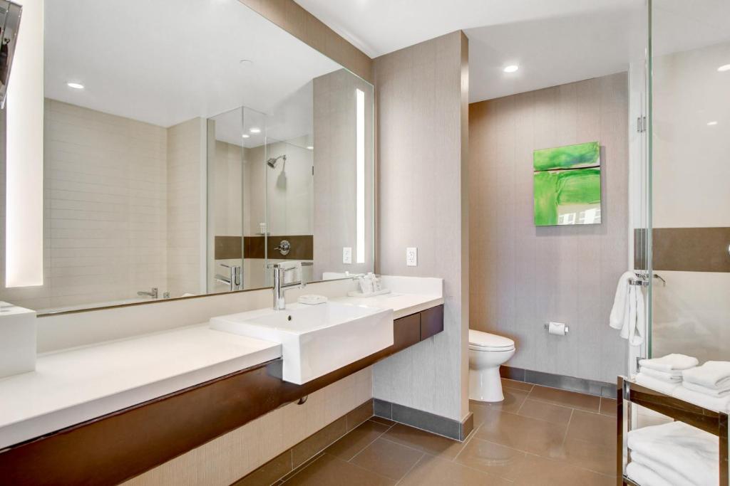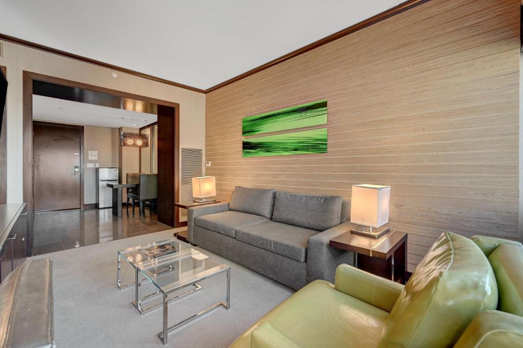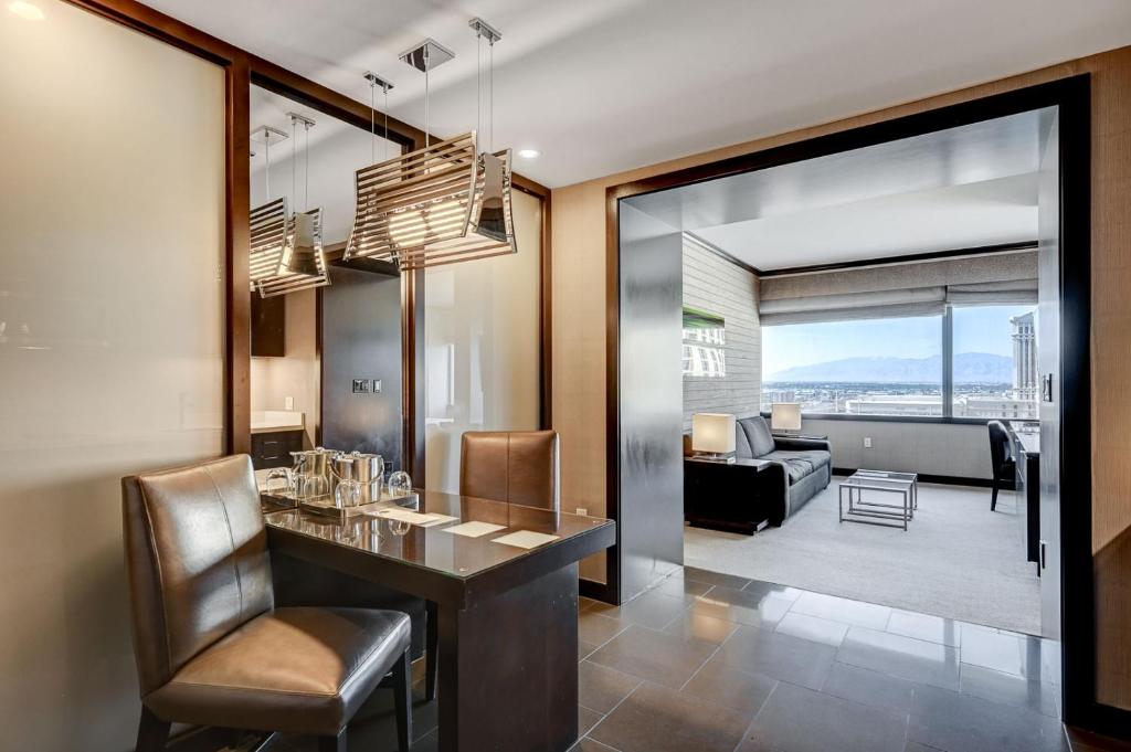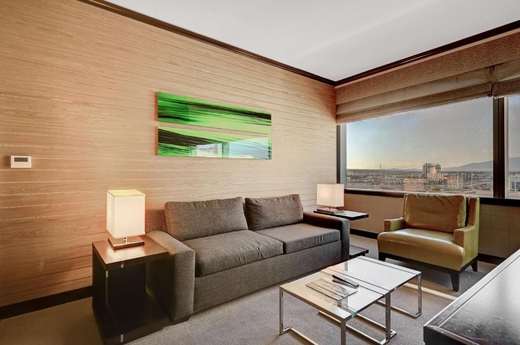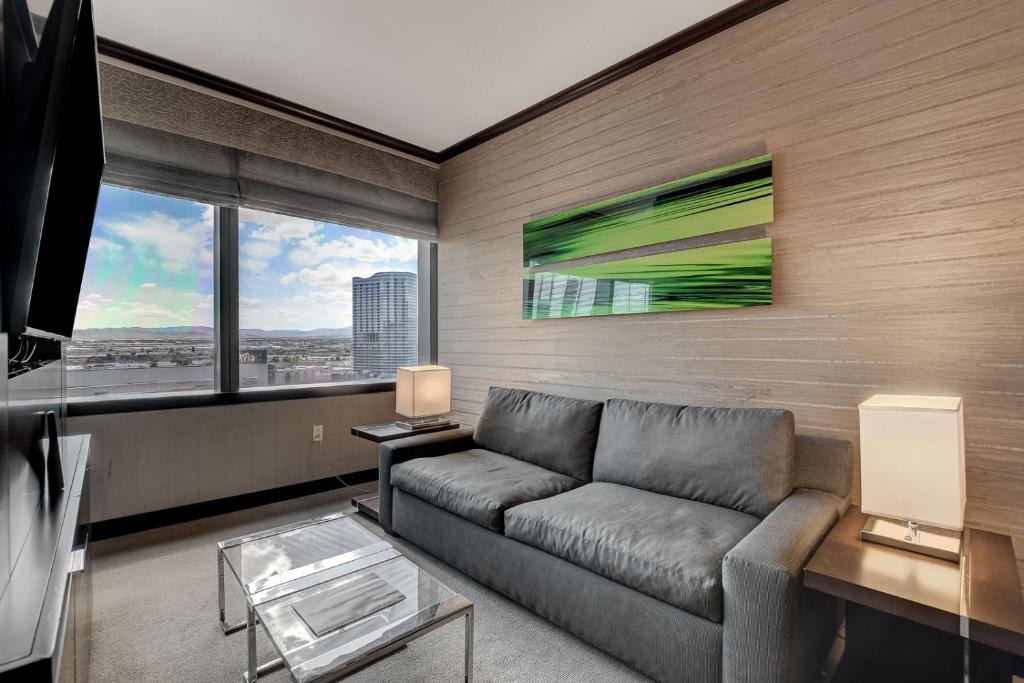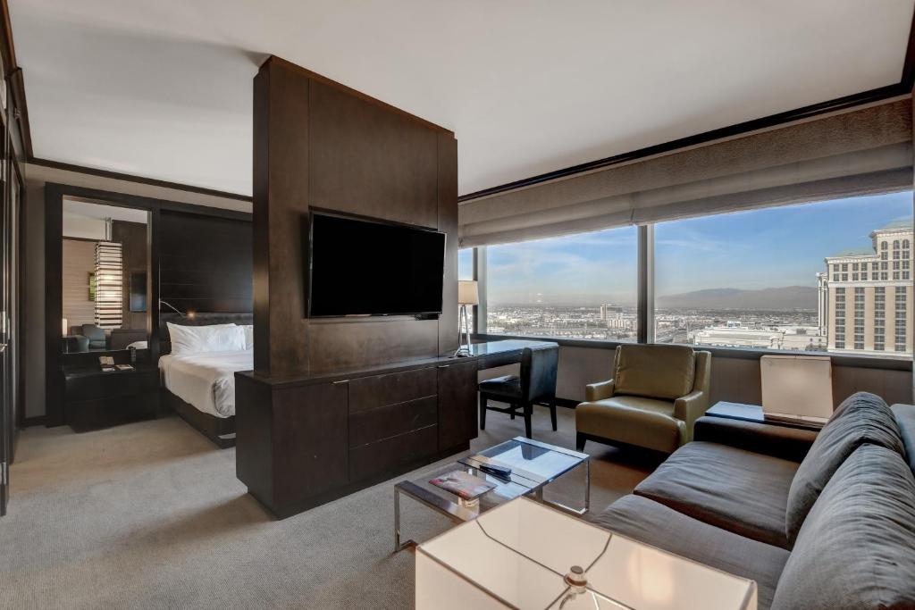 Rommet er designet med fokus på komfort og stil, og inkluderer luksuriøse badekåper, myke håndklær og sengetøy av høy kvalitet for en førsteklasses opplevelse. Badet er utstyrt med nødvendige toalettsaker, og hårføner er tilgjengelig for å gjøre morgenrutinen enklere. Med separate stuer og mørkleggende gardiner kan gjestene nyte privatliv og fred, noe som gjør Vdara til det ideelle stedet for både avslapning og underholdning.